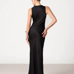 The floor sweeping silhouette lengthens your frame. The sleeveless cut, and round neckline give a clean and refined look.